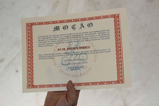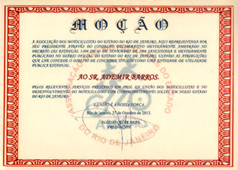 A Associação dos Motociclistas do Estado do Rio de Janeiro (AMO-RJ), com mais de 3 milhões e 600 mil associados, representada pelo seu Presidente, Sr. Aloisio Cezar Braz, entregou em evento realizado no dia 27 de Outubro de 2013, pelo aniversário do Moto Grupo Preguiça, MOÇÃO a ADEMIR BARROS, pelos relevantes serviços prestados à comunidade e em prol da união dos motociclistas e no desenvolvimento do motociclismo, com comprometimento em nosso Estado do Rio de Janeiro.